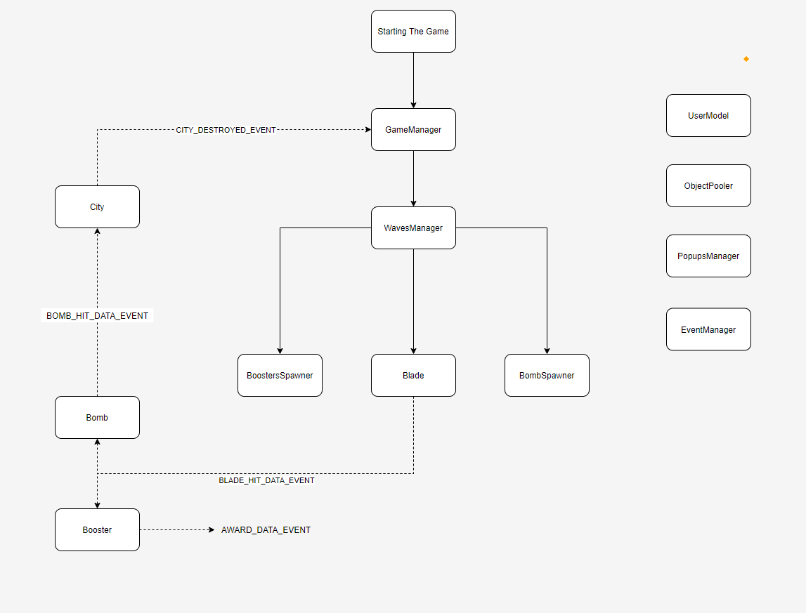 Creating code that is scalable and clear to understand, where every area of code is responsible only for itself and doesn't control others is a hard task. It demands planning the code structure ahead of time and not just "making it work" on the fly. To follow this basic code philosophy I've used an EventManager to pass events and data between areas of code. Anyone who cares for a certain event will listen to it and handle it according to a predefined protocol structure of the event's data. For example: Blade hits a bomb -> Triggers a hit event -> Bomb handles the event and creates a sliced animation. -> Triggers an award event -> GameManager updates the user's score.