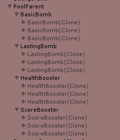 When the game starts, we insert into our pool several objects per type, and we use and re-use them. You can play the game for hours and still be using only 6 bombs and 6 boosters total!