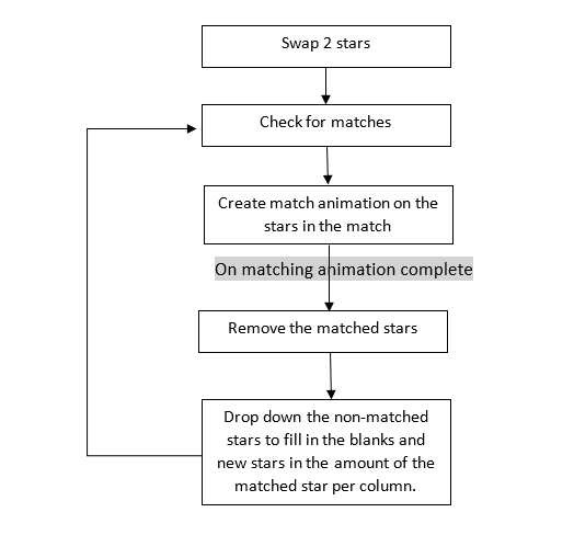 This caused all the tiles above the match to fall so that 2 additional matches were triggered of 3 yellow stars and 3 red stars.